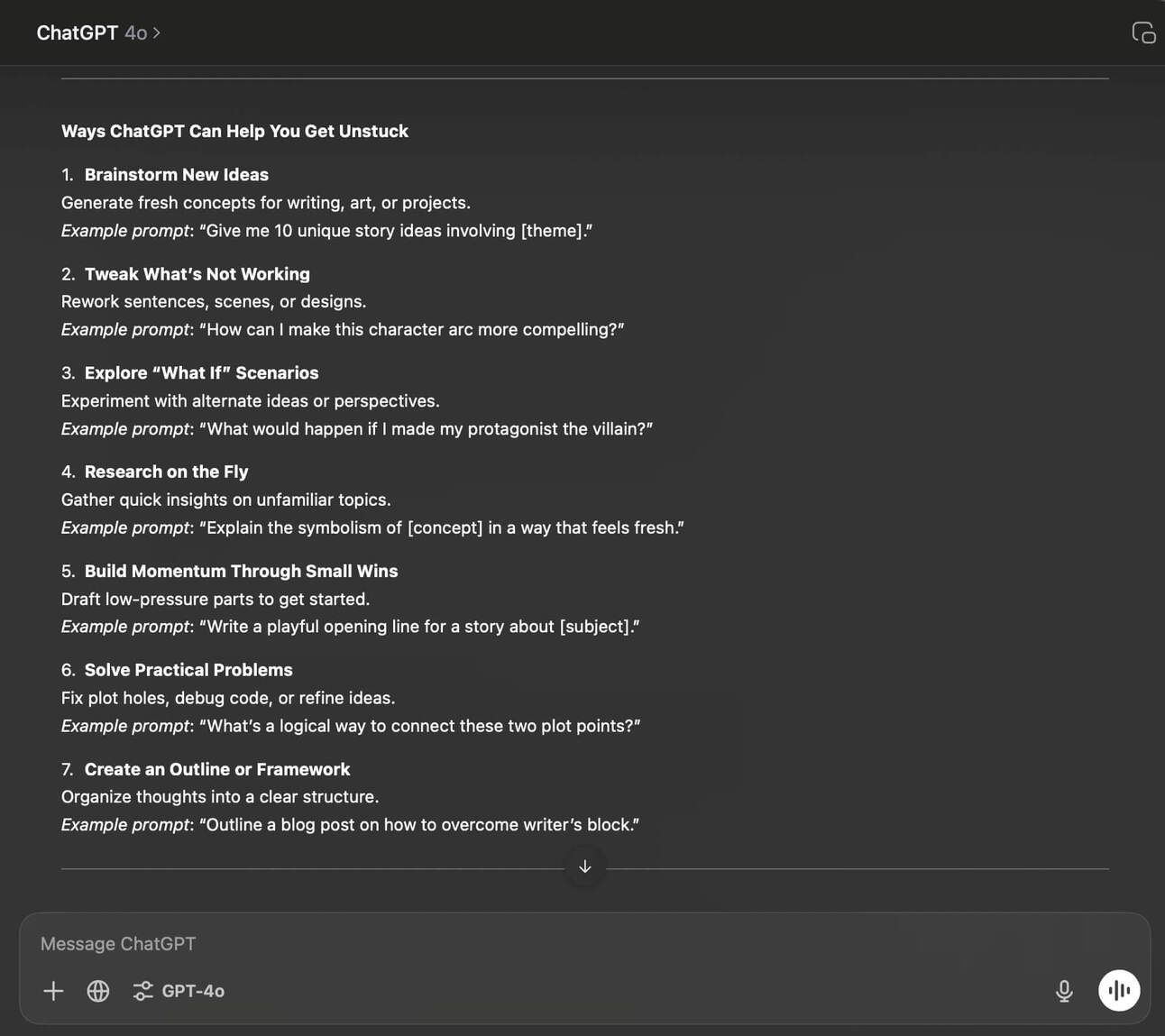 So, here are some of my favorite ChatGPT prompts that I use to break my creative blocks and get back to work.