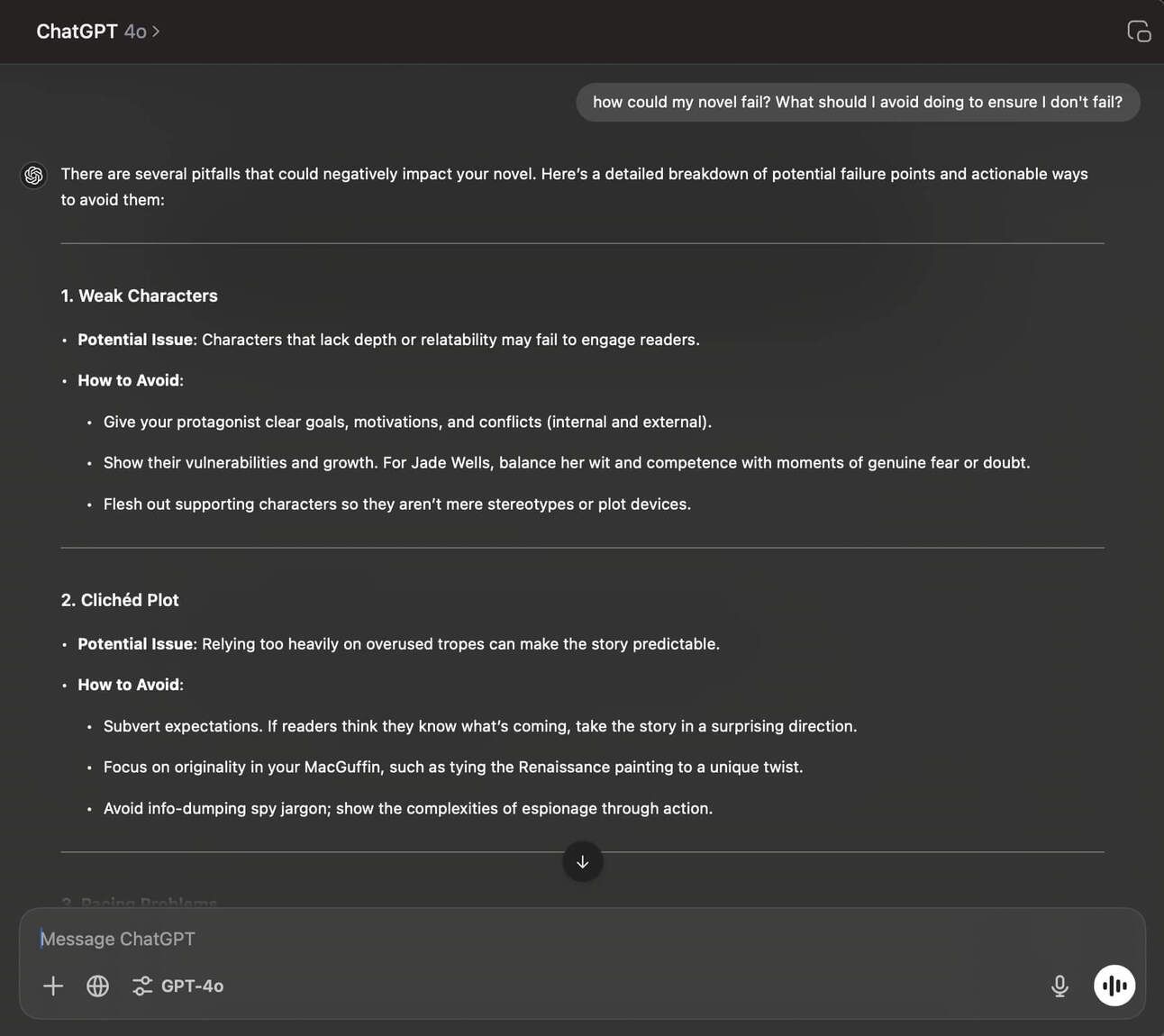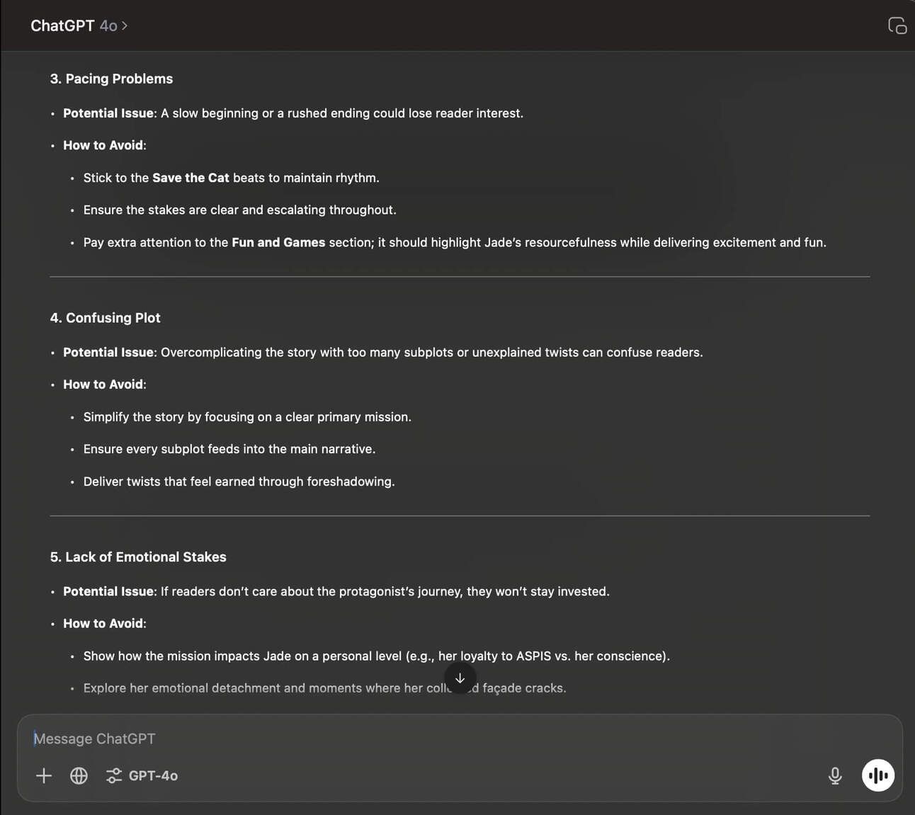 When you’re feeling creatively blocked or you’re stuck on a specific problem (like how to connect one plot point to another), ChatGPT is an fantastic tool. If you ask it the right questions, ChatGPT will give you outside-the-box ideas to shake up your process and break you out of your funk.