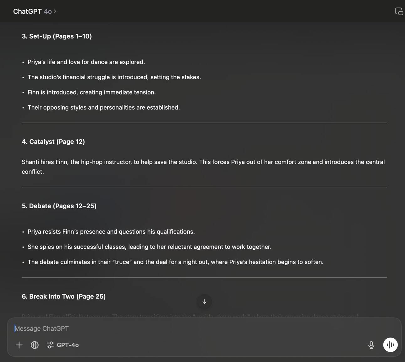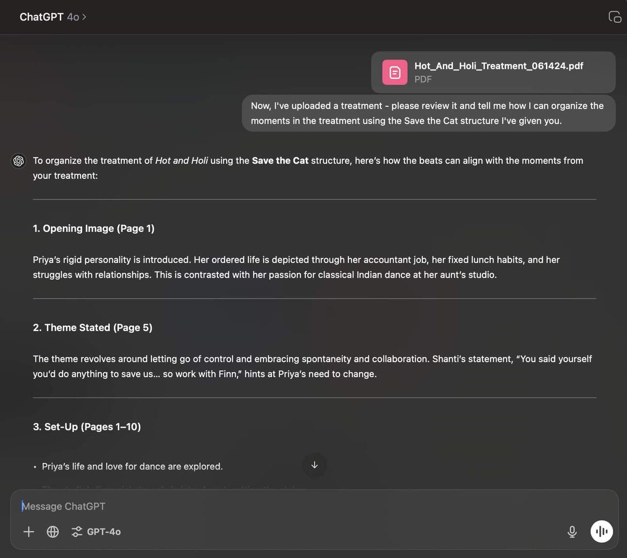 Then, I uploaded the treatment - yes, you can upload documents and have ChatGPT analyze the content. Finally, I asked it to “read” my treatment and organize the beats into the full movie structure: