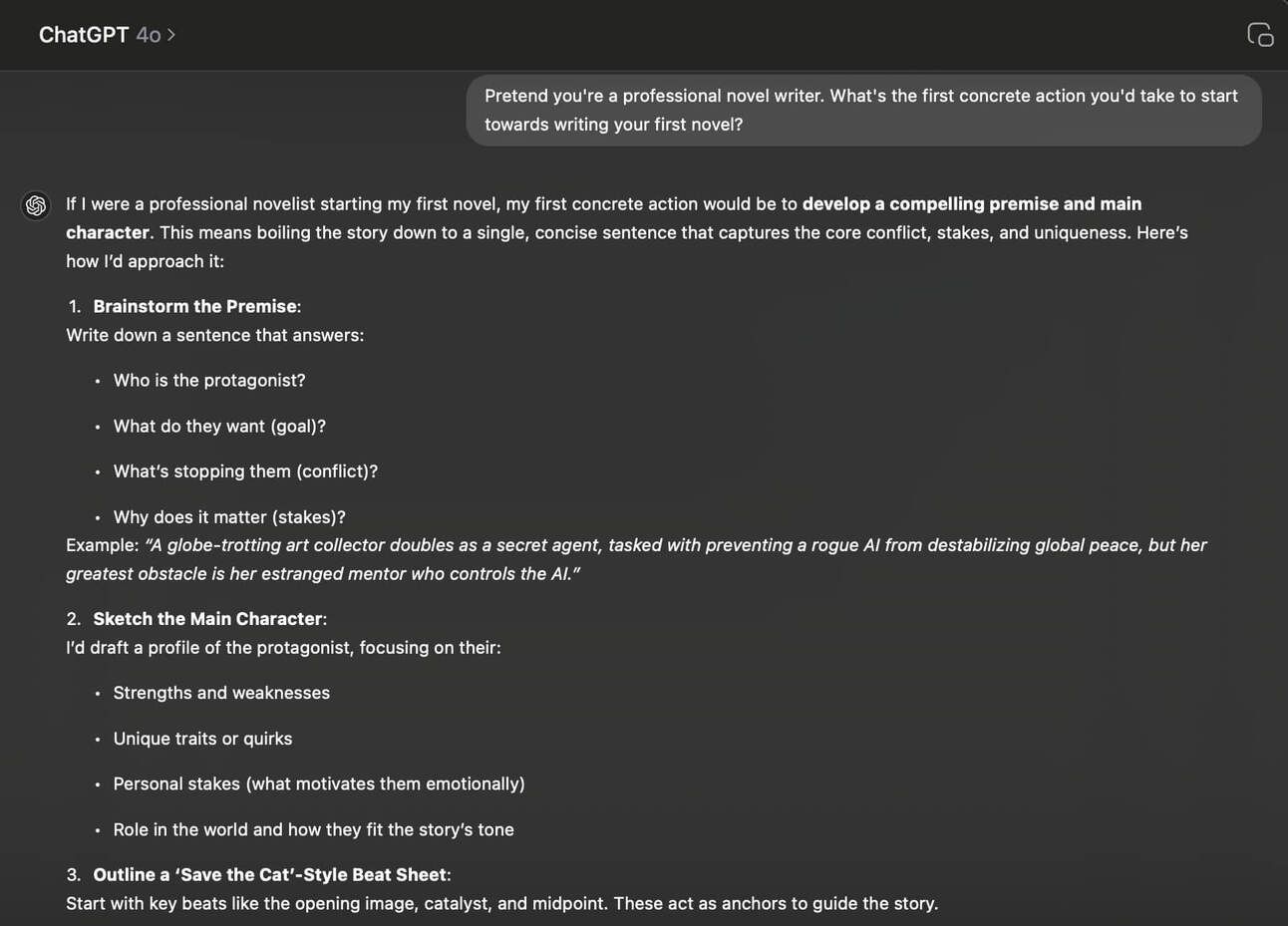 Here, I prompt ChatGPT to pretend it’s a professional novel writer and ask it to lay out how it would go about starting a novel:
